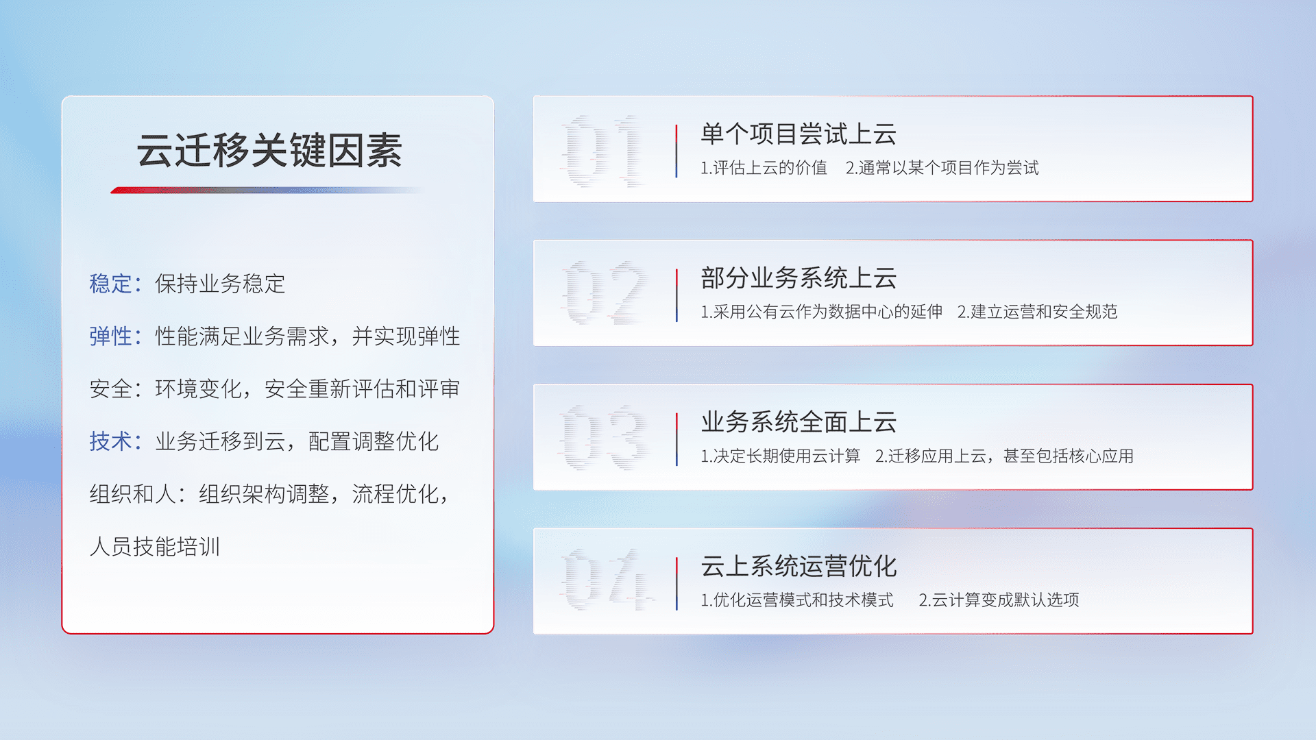 结合实际业务,,,,从规划设计、、、、云平台选型、、、云原生改造、、、数据迁移、、、集成交付,,,,迁移全过程为客户识别最佳上云路径,,做好风险识别管理,,设计网络架构、、身份权限、、、安全审计合规、、操作审计、、、日志审计、、、监控告警策略、、、多站点容灾设计等,,,对云上基础设施进行整体规划,,,,提升IT治理水平,,,,以满足弹性、、、、高可用、、、、高性能的需求。。。。